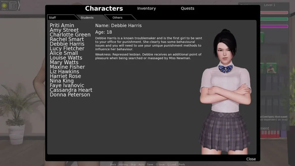 | Training Miss Potts | Progress through daily talks and assignments. | Visit her classroom, then her apartment. Follow training steps (spanking, fingering, oral). Raise her Influence. | Influence points; crucial relationship development; unlocks further options. |